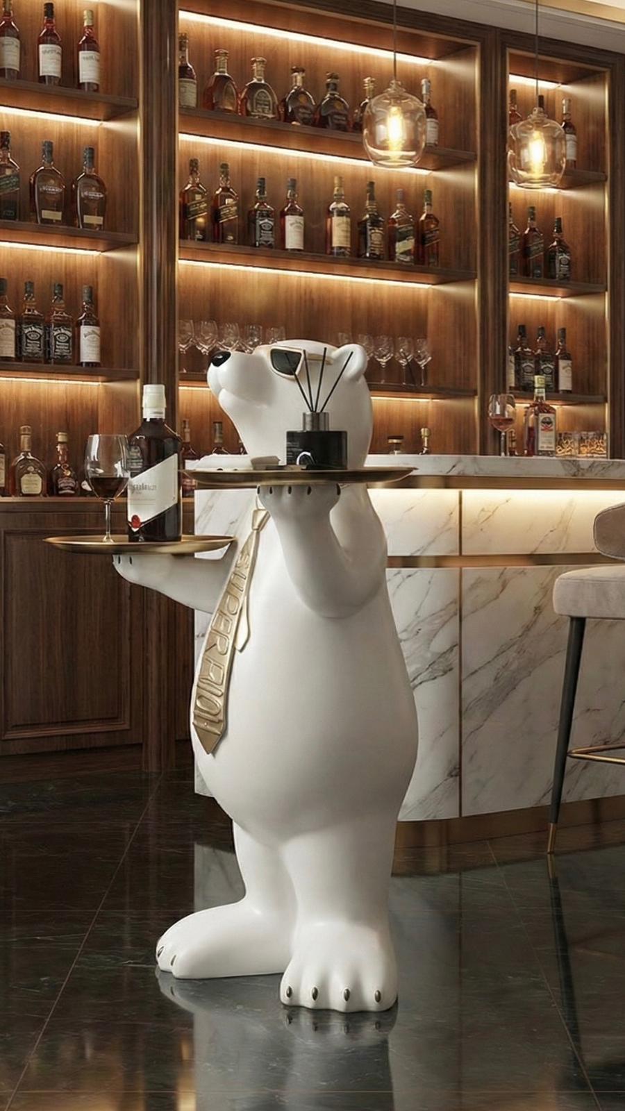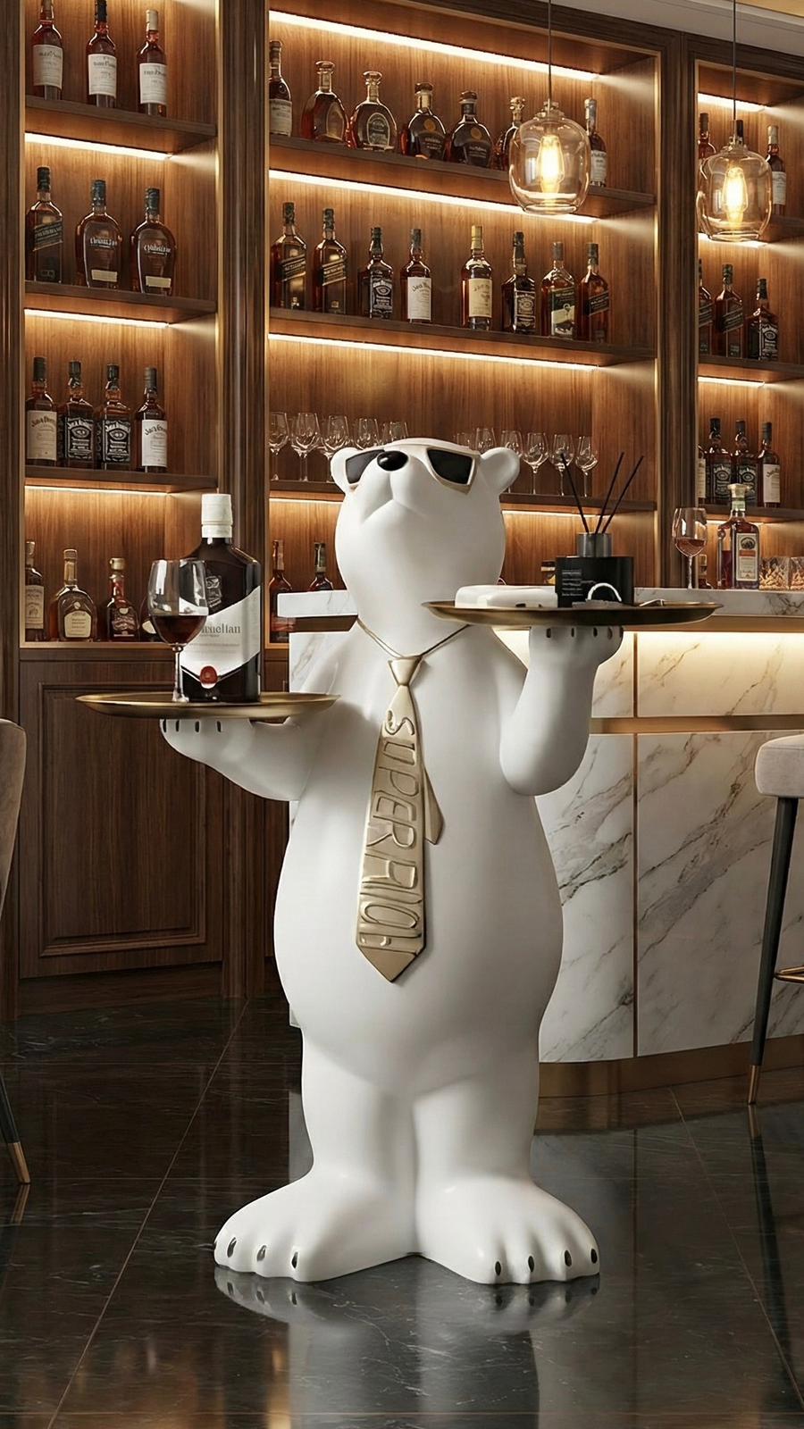 The "Super Rich" polar bear statue will add a luxurious and modern air to your space with its gold-detailed tie, cool sunglasses and presentation trays.