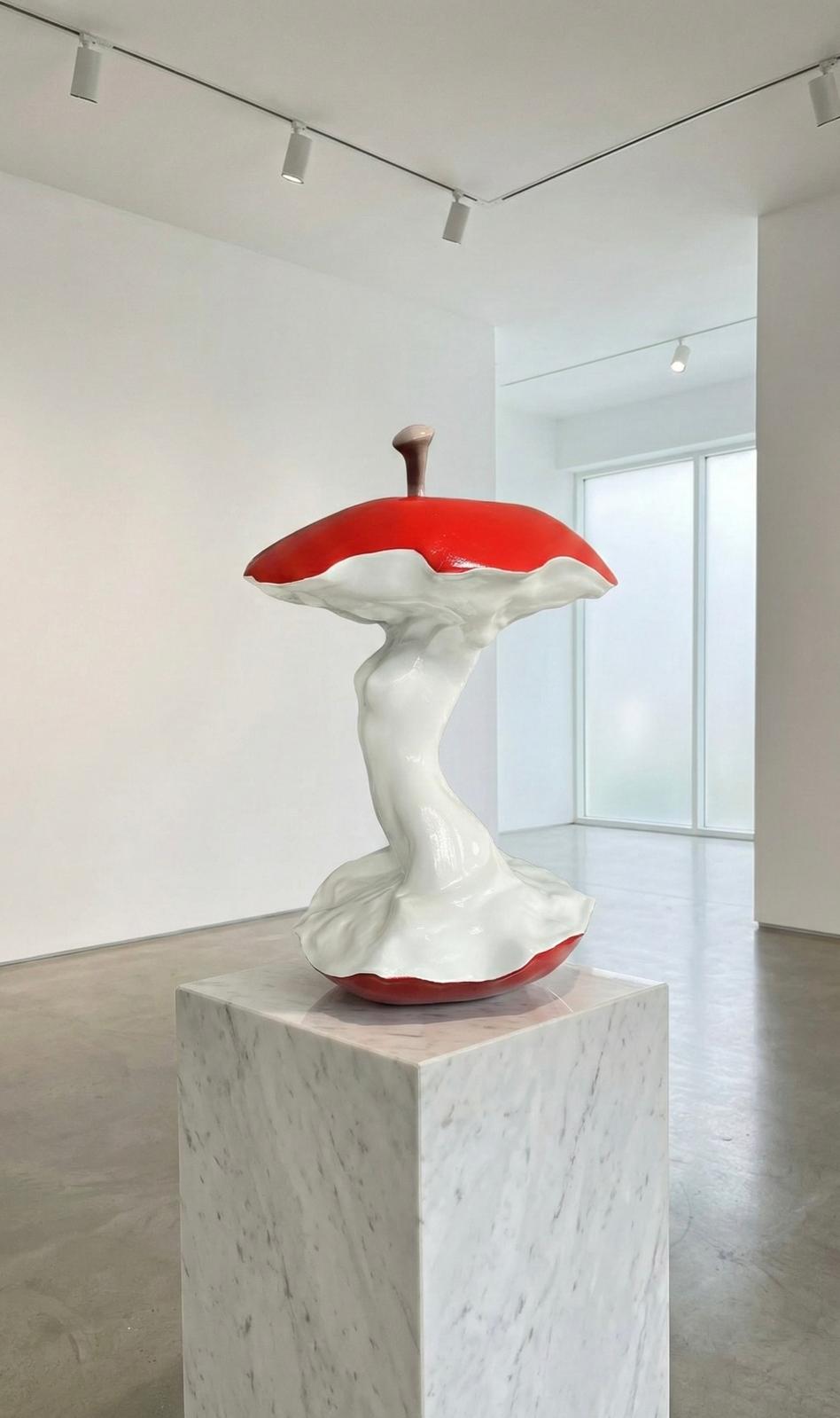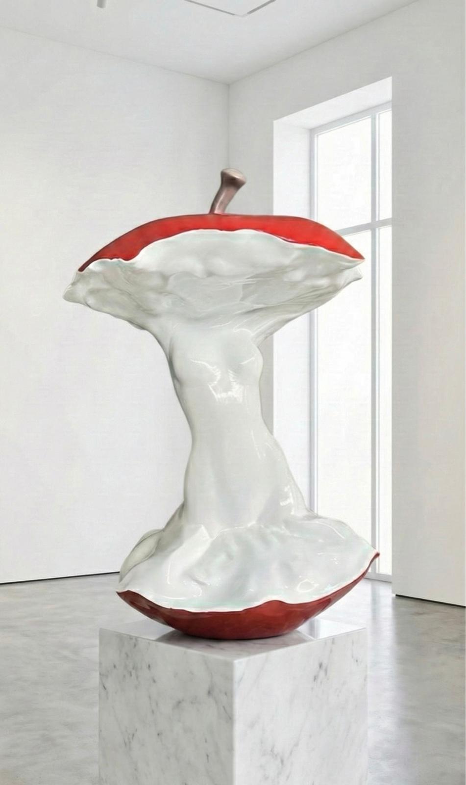 A modern art sculpture inspired by the form of an apple core, designed to bring a striking and elegant touch to any space. Its glossy red and white surface, combined with smooth organic lines, creates a dynamic and contemporary aesthetic.
